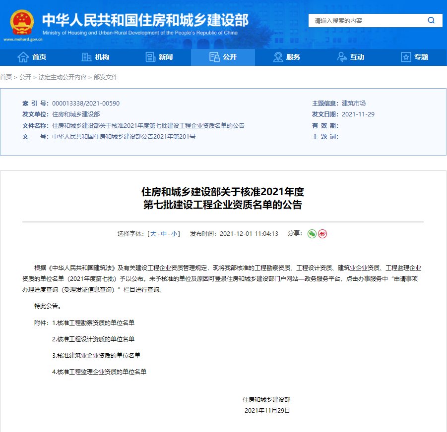 12月1日,住房和城乡建设部发布《关于核准2021年度第七批建设工程企业资质名单的公告》,集团子公司湖南警安工程有限公司通过建筑装饰工程设计专项甲级资质核准!
