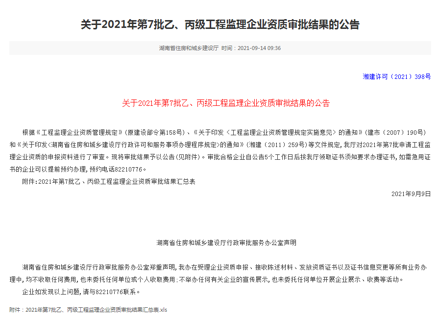 近日,湖南省住房和城乡建设厅公告了2021年度第7批乙、丙级工程监理企业资质审批结果,集团子公司湖南警安工程有限公司通过房屋建筑工程监理丙级资质审批。